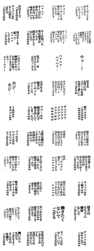 キモい台詞をスタンプにしました。懐かしい一昔前のテイストのきもい文章をお楽しみくださいでござる。気持ち悪いのでご使用には注意。キモオタ、オタク、ゴザル。デカ文字第六排便魔王 より発売