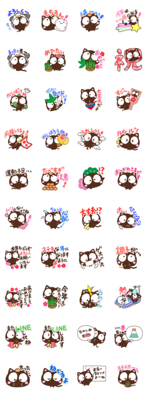 『こげちー』スタンプの【お正月&体調気遣い】編になります。新年のあいさつから、体調等の気づかいなどを集めた猫スタンプです。 ねこ好きな方にぜひ。【かたこ】