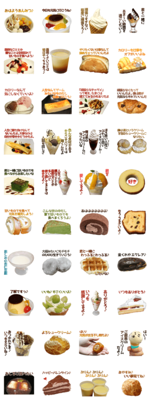 優しい言葉をかけるスイーツのスタンプです。ケーキ,プリン,あんみつ,シュークリーム,デザート,パフェ,アイス。カップル、バレンタインデーにも。実写やさしい食べ物。竹野チコ より発売
