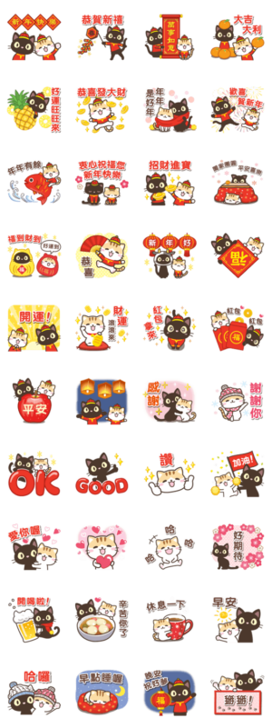 黒猫のクロと、ときどき登場する三毛猫のミケの旧正月・春節向けスタンプです♪ジグノシステムジャパン より発売