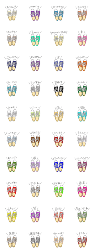 ありがと、ごめんなさい、了解です、おはよ、おやすみ、既読、いってきます、おかえり、暇、すみません、笑、など毎日使える言葉を集め、カラフルなスニーカーにしました。