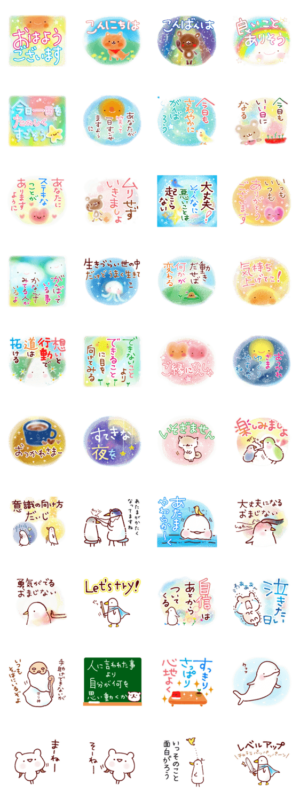 前向きに生きるスタンプの第二弾です。何だかうまくいかない時・ちょっと辛いとき・気持ちを上げたいときなど、大切な人・自分にもやさしくエールとちょっぴりユーモアを♪