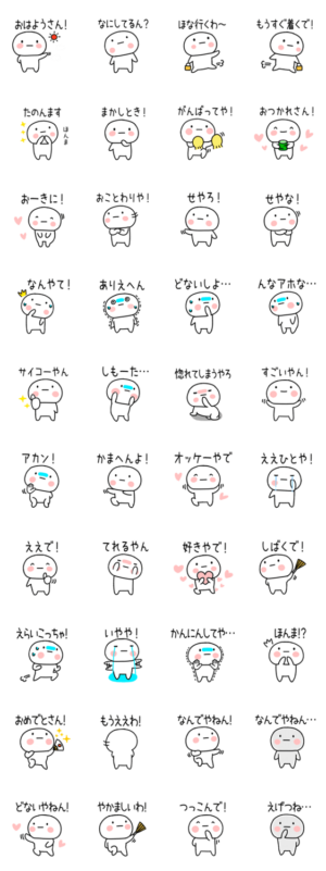 日常で無難に毎日使える関西弁を選びました。関西弁をしゃべる「関西弁くん」スタンプです。しろくてまるいキャラクターです。(もるきゅた作)