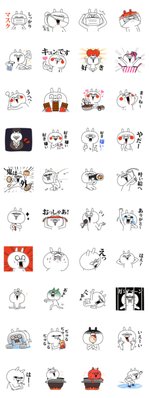 興奮のあまりすごい顔になってしまったウサギのスタンプ☆日常で使える言葉のほか、コロナ禍・バレンタイン(恋愛)・節分・冬など季節モノも入ってます☆DECOR より発売