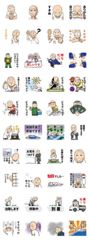 どこにでもいる田舎在住おじいちゃんのスタンプ。 表情豊かで挨拶なども手軽に、和やかに。 田舎に住む人や、いつものグループ、友達などにオススメです。