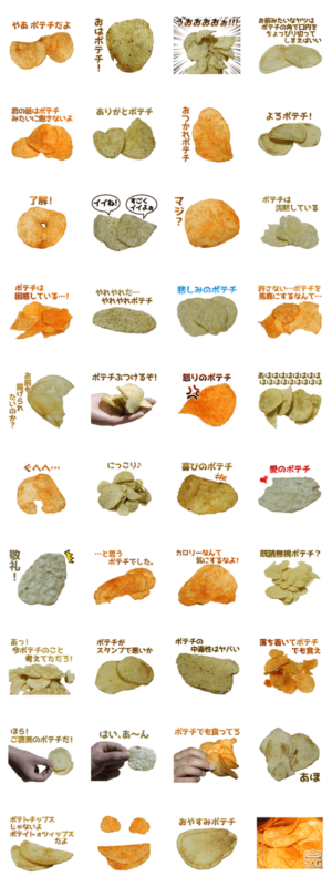 ポテトチップスの写真で作った実写スタンプです。一度食べたら止まらないポテチをどうぞ♪飯テロ。じゃがいも、ジャガイモ、芋、お菓子。実写食べ物スタンプシリーズ。竹野チコ より発売