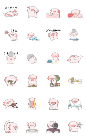からめる氏の有名キャラ「急に全てが嫌になったウーパールーパー」のカオスで動きの激しいスタンプ。全体的に動きがダイナミックでシュールなのが笑いを誘う。長く見ているとかわいくもなってくるかもしれない。