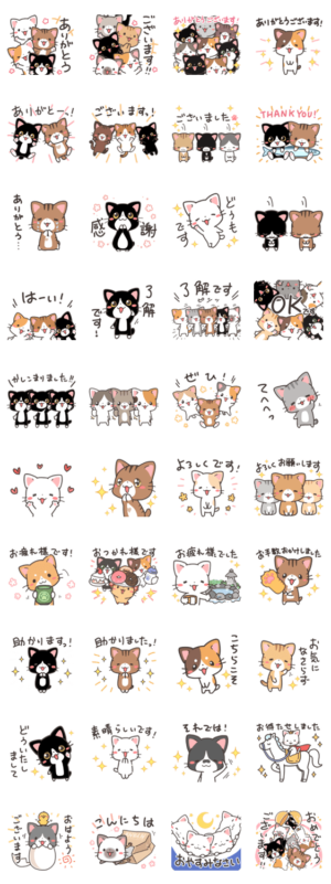猫づくし。よく使う感謝と返事のスタンプです。とても良いです。