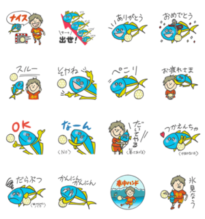 ハンぎょボール&春の全国中学生ハンドボール選手権大会のスタンプ。富山県氷見市の名産「ブリ」と少年の掛け合いがほっこり。氷見弁も思わず使いたーなるちゃ。氷見市ハンドボールを核としたまちおこし推進協議会 より発売