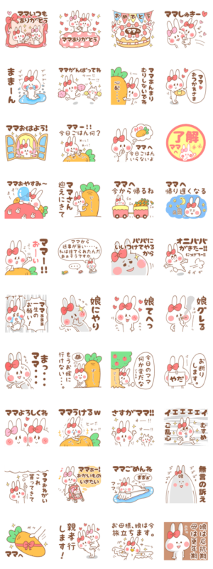娘から母へ送るスタンプ。よく使う言葉(日常会話・挨拶・連絡・おめでとう・ありがとう)など。母の日にもどうぞ。娘用ですが、お父さん(パパ)が嫁さんに使ってもOK!じゃむばたチーズ より発売