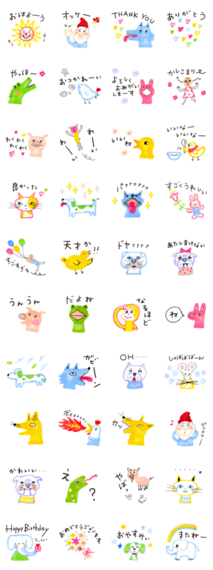 カラフルな動物たちの毎日使えるスタンプです。仲の良いお友達とトークを楽しんでね♪※こちらは「ペンで描いた動物たち」の改訂版です。