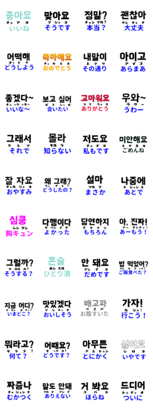 韓国語の読み方と意味がわかるシンプルなスタンプです。相づちの表現が多いので、韓国の友達との会話や韓国ドラマが好きな人との会話に使ってもらえると嬉しいです。