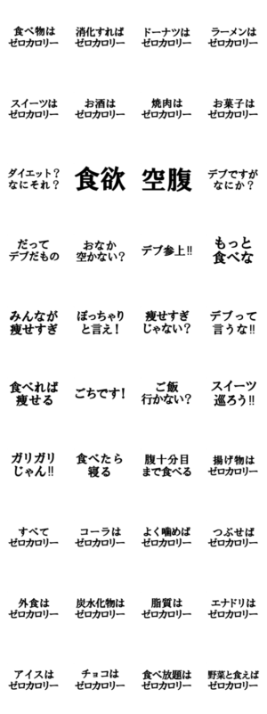 食欲がとまらない事への引け目をなくせるスタンプです。0cal 食べ物ドーナツ 食欲 野菜 炭水化物 揚げ物 外食 お菓子 スイーツ アイス チョコ デブ ゼロカロリー ラーメン