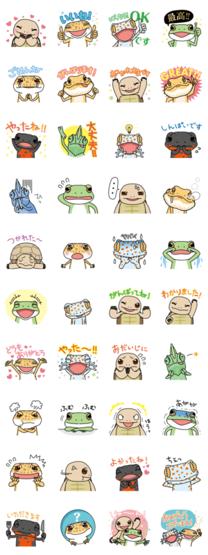 可愛いイモリ・レオパードゲッコウ・ヒョウモントカゲモドキ・トッケイヤモリ・リクガメ・カエル・フトアゴヒゲトカゲ・カメレオンのスタンプ40個。爬虫類・両生類好きへ。