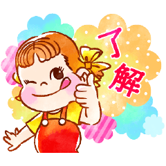 いつものペコちゃんよりもライトが強く当たったような、眩い色具合がイ感じのスタンプです。
