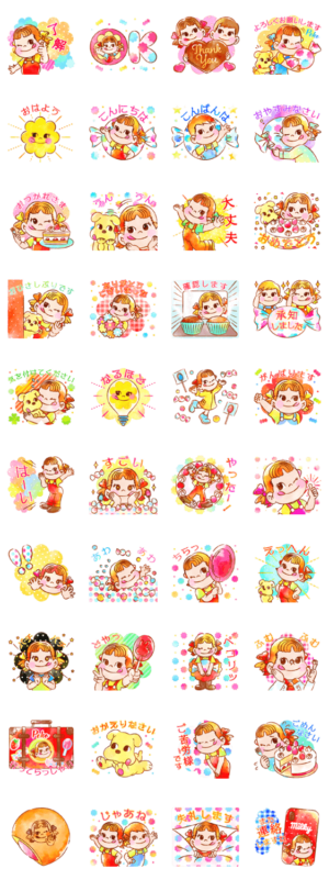 大人気!ペコちゃんとお菓子のかわいいスタンプが登場♪カラフルでおいしそうなお菓子と一緒にお返事しちゃおう★