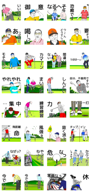 "おやじのゴルフ"第六弾!ゴルフおやじ達の心の叫び、苦悩と悶絶、歓喜と分かち合いの一コマをスタンプにしました。日々のゴルフコミュニケーションにご利用ください。タナカミノル より発売