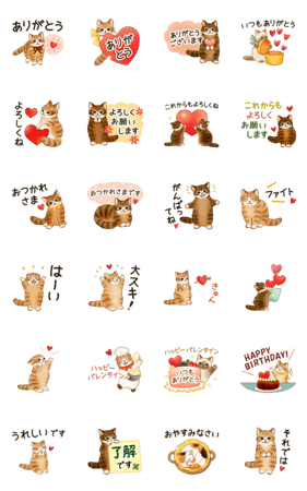 『気持ち伝える☆猫たちのスタンプ』より24匹が動くスタンプになりました♪ 友だち同士で使えるものから敬語まで。バレンタインにもどうぞ