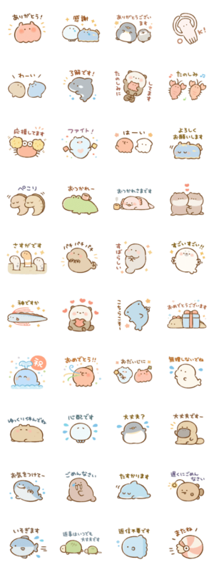 海や川に暮らすいきものたちの、思いやりや気づかい表現多めのやさしいスタンプです。メンダコ、ペンギン、アザラシ、ウミウシ、ウツボ、カピバラなど #初売りスタンプ