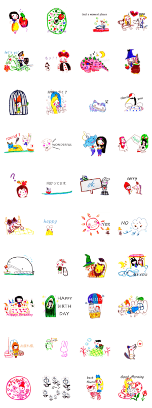 マーカーや色鉛筆で落書きした童話の仲間達です。アリス、シンデレラ、アラジン、美女と野獣、白雪姫やティンカーベルに日本の桃太郎やかぐや姫等もいれました。おくしまかおり より発売