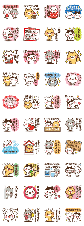 気づかい・思いやりの気持ちがこもった言葉やポーズ。それらがギュッと詰まった、かわいいにゃんこ達のスタンプ♪あったかい気持ちを伝えられるセットです。みーすけ より発売