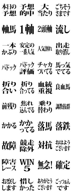 競馬のスタンプ第二弾です。使いやすい競馬用語の文字スタンプです。馬券の購入時や競馬観戦などに使ってください。Brody Machine より発売
