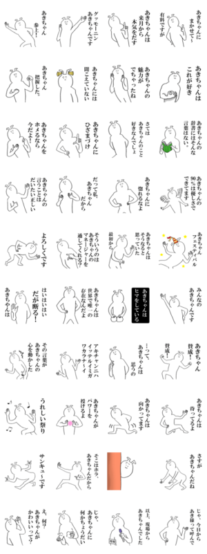 犬の名前はあきちゃんです。あきちゃんは自分にとっても正直。そんなあきちゃんのためのシュールなスタンプです。第四弾まで好評発売中です。