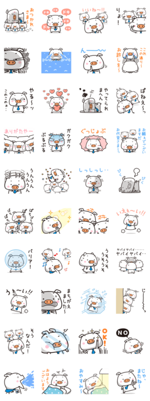 おつかれさま~な毎日に癒しと元気を届ける「ブーブー団」第3弾、おはよーからおやすみまでよく使うスタンプが盛りだくさんな基本セットが出来ました(/・ω・)/頑張れ~♪