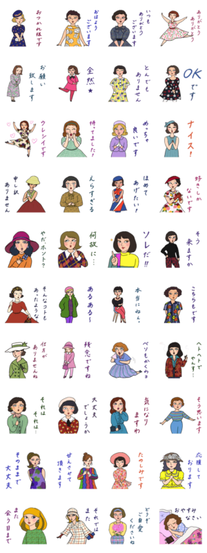 1950年代、60年代、70年代のレトロなファッションを楽しむ、お洒落な女性たちのスタンプです。WH より発売