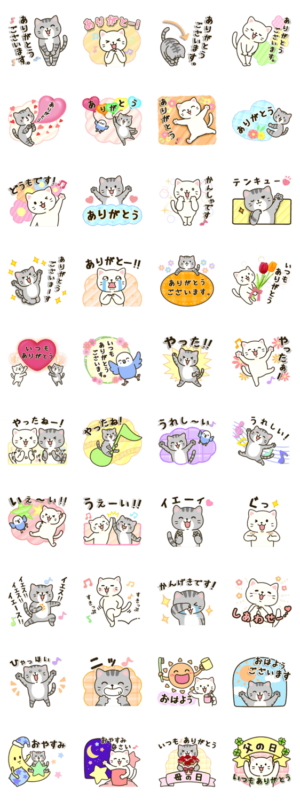 「ありがとう」と「うれしい」のスタンプです。イベントの母の日、父の日と毎日使う「おはよう」「おやすみ」もちょっとあります。