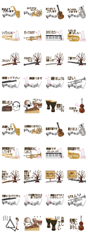 吹奏楽での使用楽器を集めて丁寧語&敬語バージョンのスタンプを作りました サックス ホルン ギター ユーホニアム トランペット ピアノ ファゴット フルート コントラバス