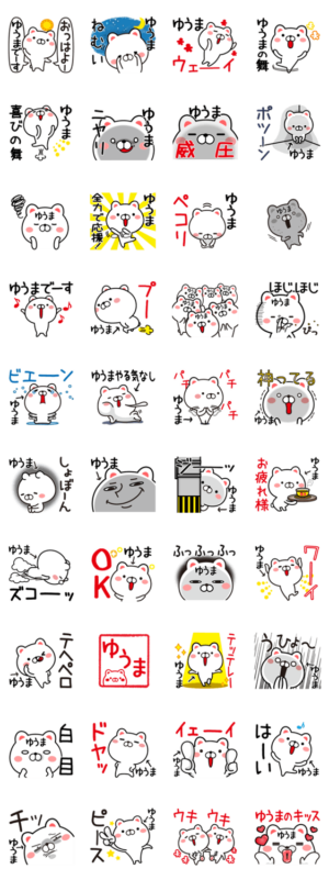 ゆうまさんが使うスタンプ。悠馬,優馬,勇馬,有馬,遊馬,佑真,佑磨,佑馬,侑真,侑磨,優真,悠真,悠磨,祐磨,裕馬など全国のゆうま専用のスタンプ