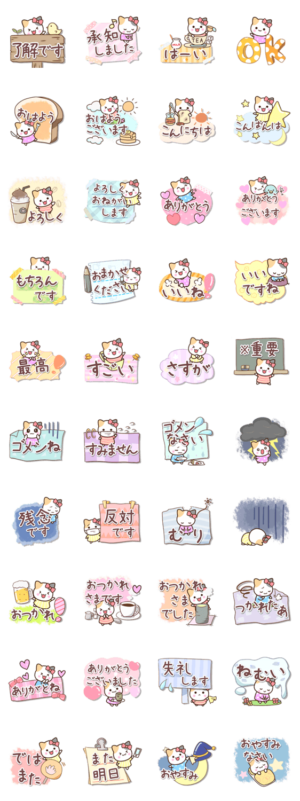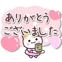 ワンピースを着てリボンをつけた、『かわいい三毛猫』スタンプです。可愛い飾りと一緒に、かわいく返事ができます。ネコ好きな方にぜひ。【かたこ】