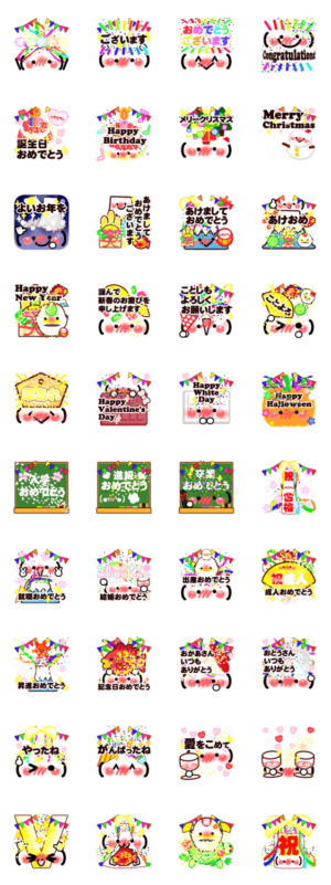 かわいい顔文字メッセージのスタンプです。お祝いの言葉を集めてみたよ。クリスマス、お正月、バレンタインデー、父母の日、ハロウィン、入学・卒業・合格・結婚祝い等に♪