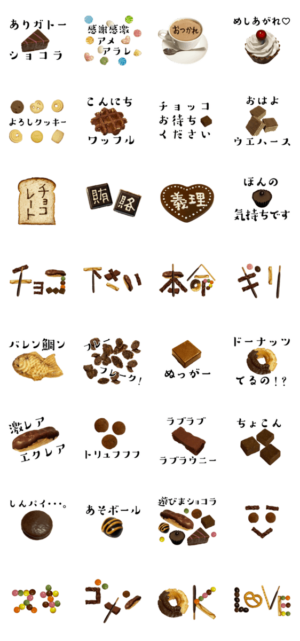 大好きなチョコレートとダジャレが合体。甘そうで可笑しいスタンプの数々です。