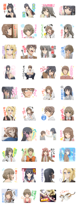 テレビアニメ「青春ブタ野郎」シリーズのスタンプです。アニメで印象的だったシーンがスタンプ化され、普段の会話などでも使いやすいです。