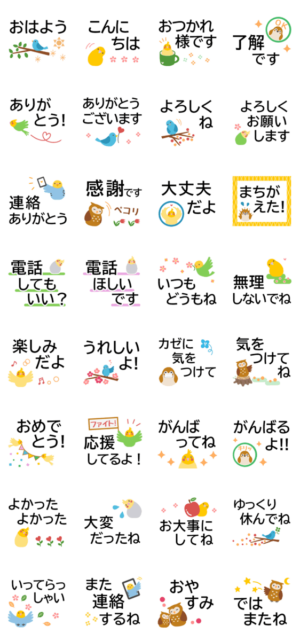 フクロウやスズメやオカメインコや幸せの青いトリで毎日使いやすいスタンプ。シンプル日常会話や簡単なお返事に。読みやすいフォントだから弱視老眼や高齢親にも優しいです