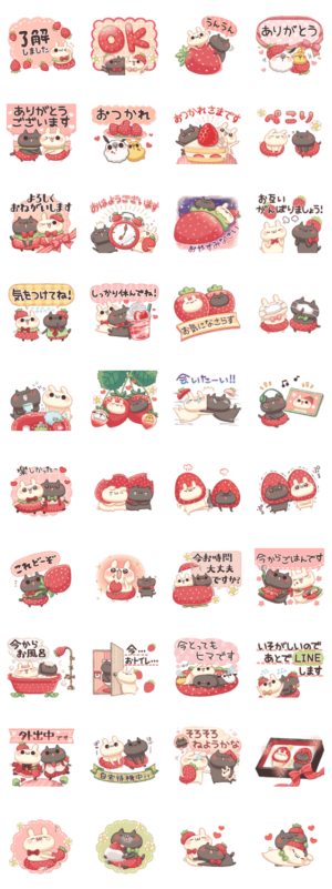 うさぎのしろとねこのくろの仲良しスタンプ第二十弾です。今回のスタンプは苺まみれ!苺好きもそうでない方も是非ご堪能下さい!