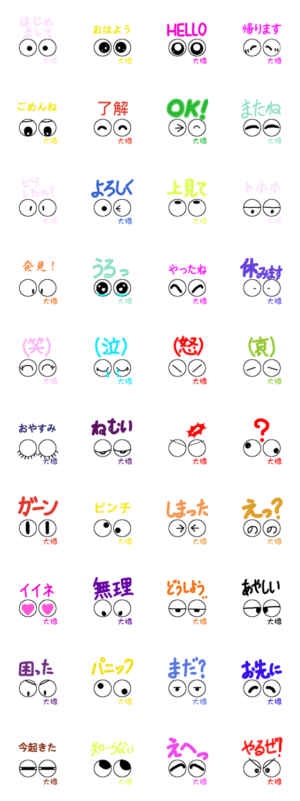 かわいい目玉の日常会話・あいさつ・気持ち 了解 はじめまして おはよう HELLO 帰ります ごめんね またね どうしたの? よろしく 上見て OK トホホ 今起きた
