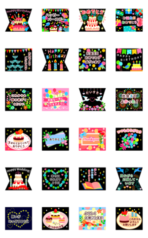 黒い背景が、よりカラフルさを引き立てています。もらうと楽しい気持ちになれるスタンプです。