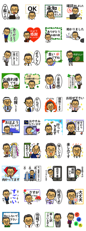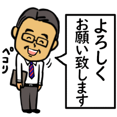 明るい笑顔の中高年男性シリーズ。今回は仕事で使うスタンプ。老眼の方にも見やすいくっきりデカ文字。ビジネス、スーツ、会社員、敬語挨拶、50代60代70代シニア、おじさん