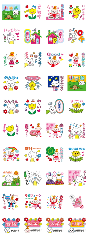 春にぴったりの使いやすいスタンプです。あいさつ・春の気分・ひなまつり・花見・祭り・エイプリルフール・卒業・入学・就職・おめでとうなど。