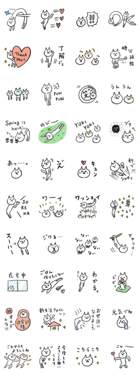 シュッとスリムな猫たちの自由気ままなゆるスタンプです。春に使えるフレーズをそっと添えてみました。OTOBOOK より発売