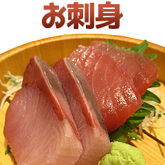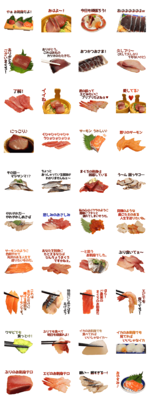 お刺身の写真で作ったスタンプです。まぐろ、サーモン、ぶり、サンマ、アジ、ビントロ、しめ鯖、カツオ、イクラ、エビ、海老。海鮮。魚飯テロ。実写食べ物スタンプシリーズ竹野チコ より発売