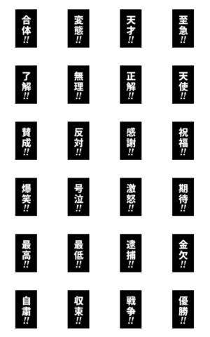 スマホ画面全体を占領して、合体!変態!天才!至急!了解!無理!正解!天使!賛成!反対!感謝!祝福!爆笑!号泣!激怒!期待!最高!最低!逮捕!金欠!自粛!収束!戦争!優勝!を表示します。くーが より発売