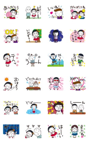 いつもと違う雰囲気のまるちゃん達がかわいい!個人的には「いけずぅ~」のスタンプがお気に入り!