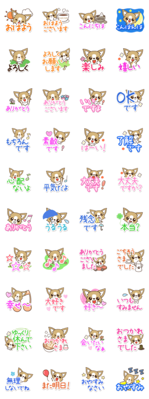『チワワ 犬スタンプ』から【基本】編です。丁寧な言葉や、敬語を集めたのでどなたにでも使えるスタンプです。犬好きの方、チワワを飼っている方にぜひ。【かたこ】