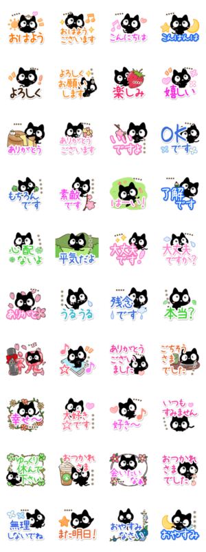 デフォルメされた黒猫の文字入りスタンプです。会話になじむ使いやすいスタンプです。