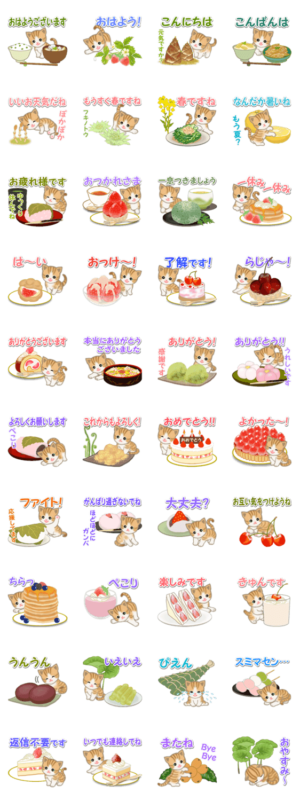 茶トラ白の子猫がご挨拶。毎日使う言葉や思いやりの言葉に、苺・サクランボ・桜餅・柏餅・草餅・ケーキ・ムース・筍ご飯・野草等春の味覚を添えて。文字大きめです。つのっち より発売