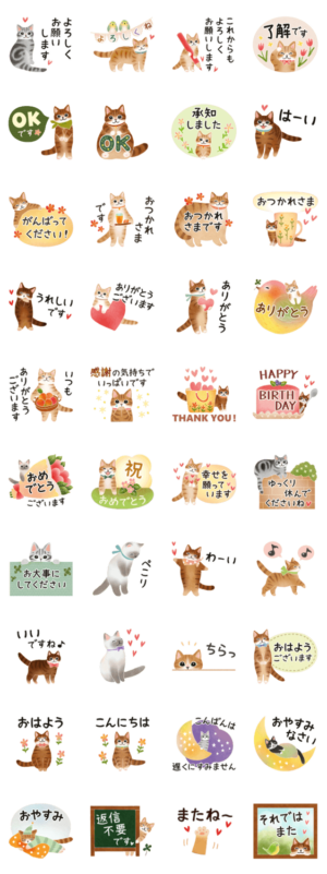 ねこたちのスタンプです。丁寧でやさしい敬語や挨拶などの基本のメッセージが多めの、毎日使えるセットです。erimari より発売